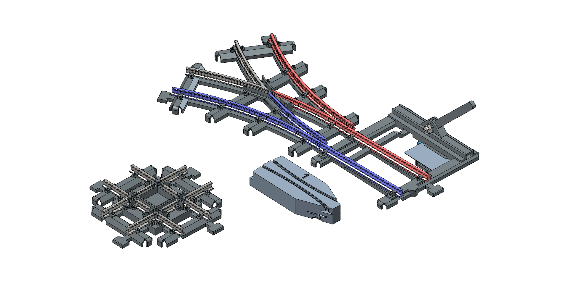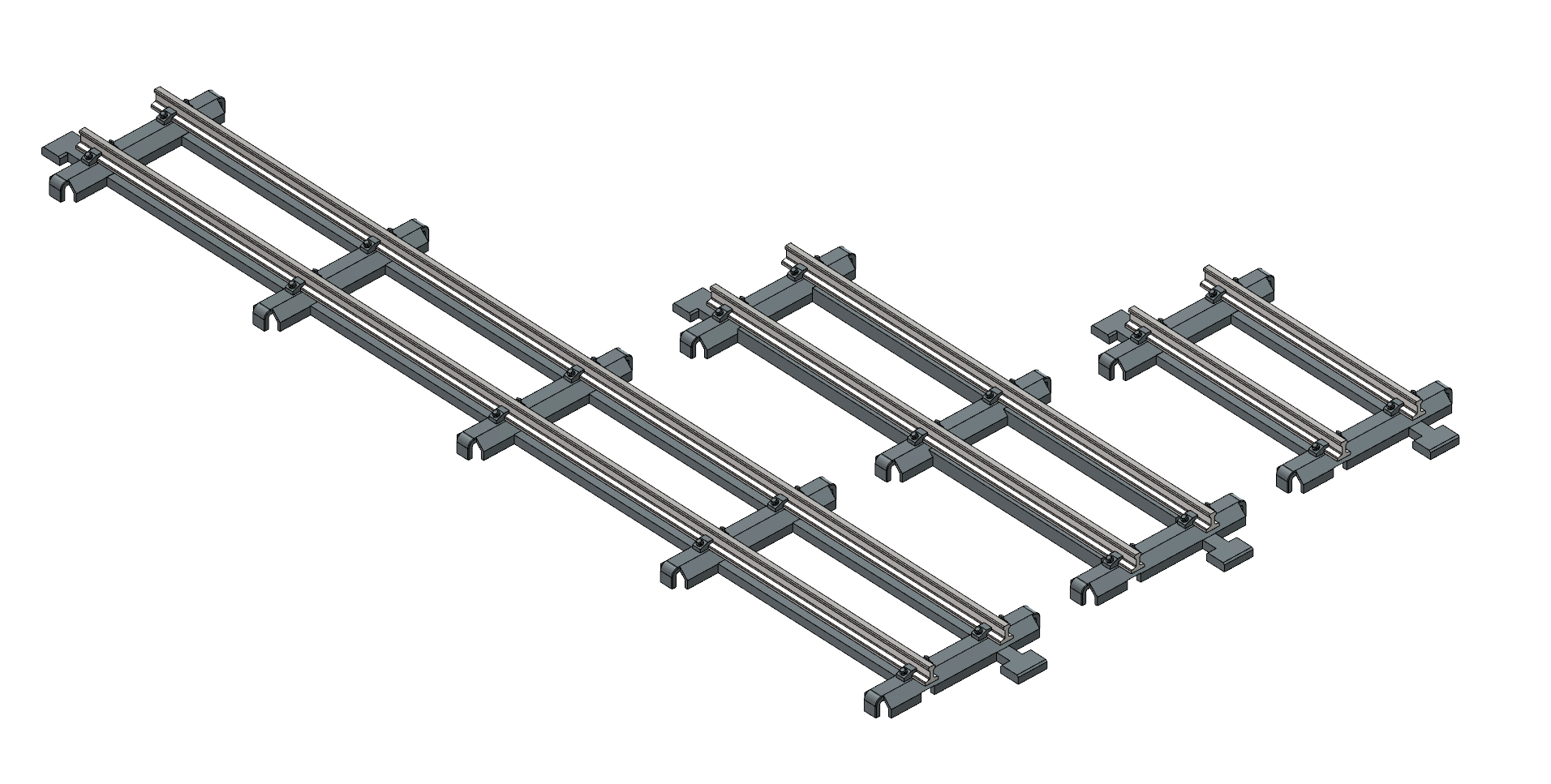 Ähnlich den O&K- und Decauville-Feldbahngleisen, entsteht ein Gleissystem aus verschiedenen starren Gleiselementen, 90°-Kreuzung und Y-Weiche. Die Gleise werden mit Haken verbunden und können auch fliegend verlegt werden. Es liegen vorgebogene und passend abgelängte Schienenprofile Code143 bei. Das Herzstück der Weiche muss zurecht gefeilt werden, dafür wird es eine Feillehre geben. Der Weiche liegt eine Stellvorrichtung bei, welche manuell bedient wird, aber auch mit einem Antrieb mit mindestens 11 mm Stellweg ausgerüstet werden kann.